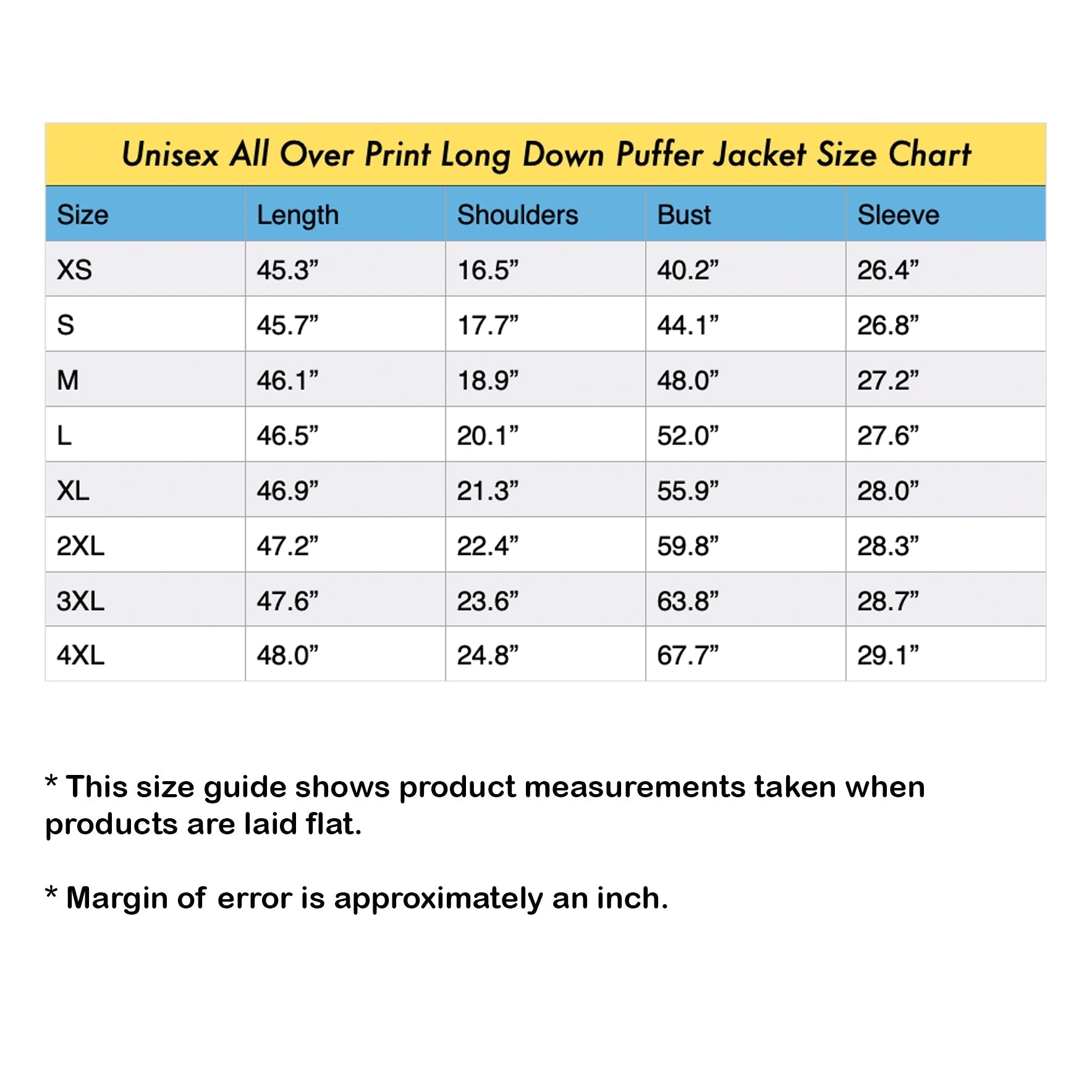 One of our coolest and relatively new products. A *down* puffer jacket that features an all-over vibrant print of one of our classic collages. It is windproof and durable and features an anti-drilling shell preventing the down feathers from protruding from its surface. It is filled with 90% high-quality white duck-down (all ducks are treated humanely during our production, no down comes from live-plucked or force-fed birds). It is light and however quite warm. It features a double zipper closure, side pockets that can protect your hands from the cold and is long and so keeps your lower body warm as well.